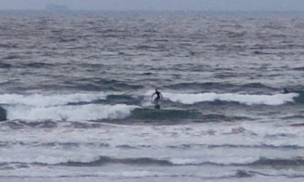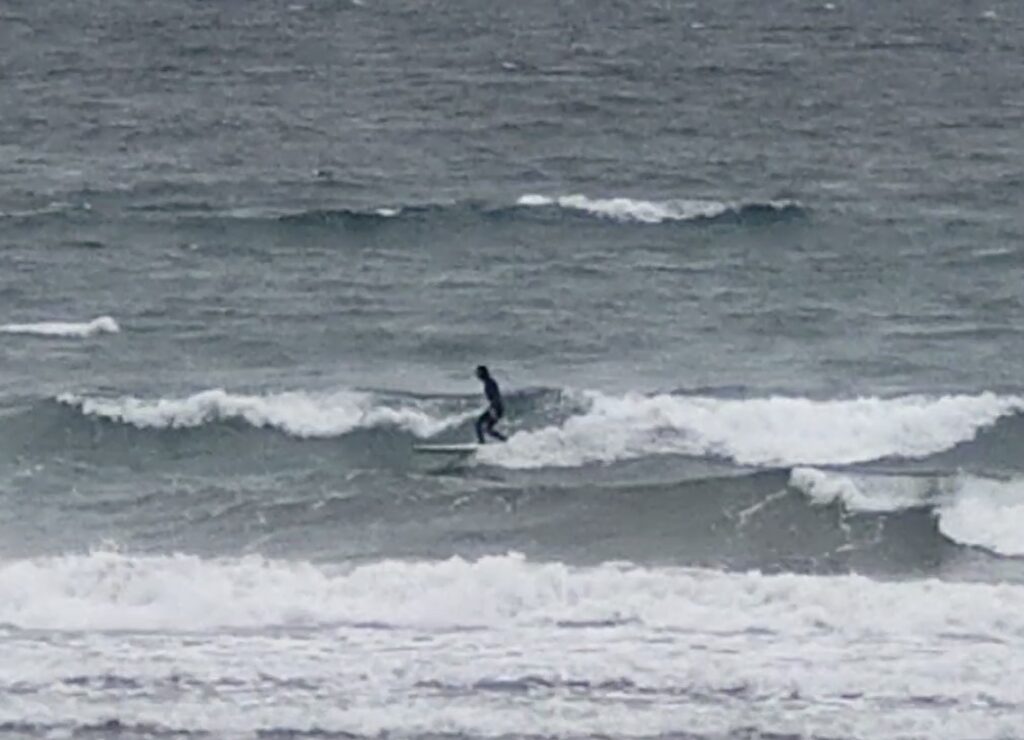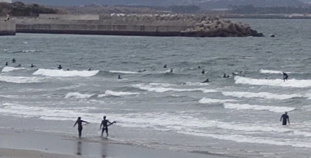 どんな装備で海へ入るか周りを見ているとブーツもグローブも無しやヘッドキャップまでしている人など色々なので私はいつも通りブーツのみで入りました。水温は10度程らしいですがグローブ無しでも直ぐに慣れました。着替えるときに昨年買ったブーツの端を引っ張ってしまって避けてしまいました(><)海に入る前から地味にテンションが下がります。波はもも位の波が全体的に割れていて浜全体で遊べそうな感じでした。オンショアの影響で波数は多いので人が多かった(280名でした)ですがそこまで取り合いは厳しくなかったです。セットは腰くらいであまりパワーは無いですが乗り易くてインサイドまで走れる波も多くて25点でしたが結構楽しめました。磯ノ浦は大阪から近く、波も良いので混むのはしょうがないですね(><)少しチョッピー気味ですが私はチョッピーは好きなので前半結構楽しめました。夕方のサイズアップを目指して来られた人で更に人数が増えてなかなかの盛況でした。疲れてきたせいもあって乗れる本数が減りましたが波を選べば走れるので今日は日曜でしたが来て良かったです。皆さん本日もお疲れ様でした