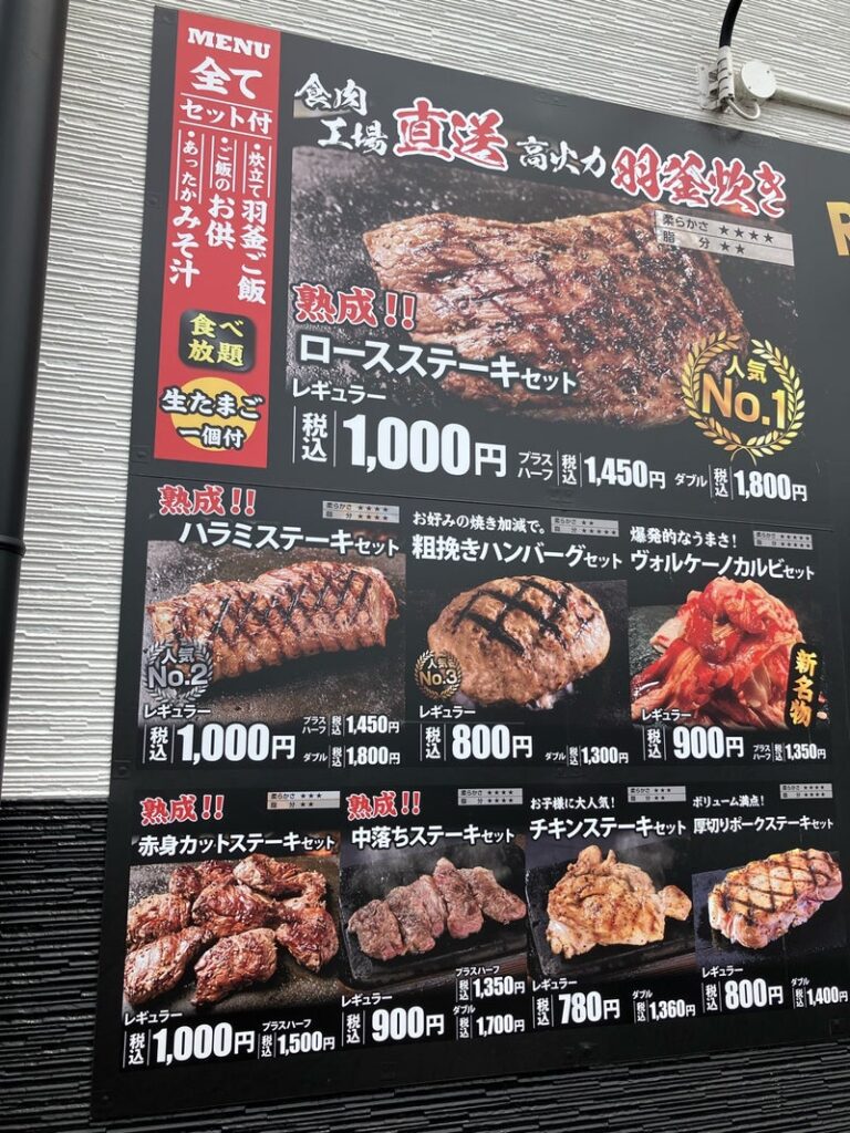 4月より交通規則が変わって自転車への罰則が強化されましたが、海へ向かっている時に自転車を見ていたのですが、歩道を普通に走行されているし、逆走も沢山見ましたのでまだまだ新ルールが浸透するには時間が掛かりそうです。私は自転車には乗らないのですが車の運転中に自転車が車道に突然出てきてヒヤッとする場面が増えたので自転車はゆっくり歩道を走って貰った方が事故が少ない気がします。今日は海の帰りに以前から気になっていた松坂にある1000円ステーキ(感動の肉と米の店)に食べに行ってきました。気になっていたと言っても看板に千円ステーキって書いてあったので結局入ったら千円では食べれないだろうと思ってました。どんなお肉がたべれるのか気になっていたので入ってみました。お店に着いた時は待たれてる人は1組だけでしたが少しするとお店の外まで並ばれてました。レギュラーのロース肉が1,000円からで、それ以外のお米やお味噌汁やその他サイドメニュー(国産牛の牛しぐれ、わかめナムル、野沢菜べったら漬け、白菜キムチ)全て無料で食べ放題でした(年齢的に食べ放題が嬉しい歳ではないですが)お米は羽釜で焚いた国産米で美味しかったです。お肉ですが提供速度も早く千円ポッキリでお腹一杯食べれます。また海の帰りに寄ろうと思います